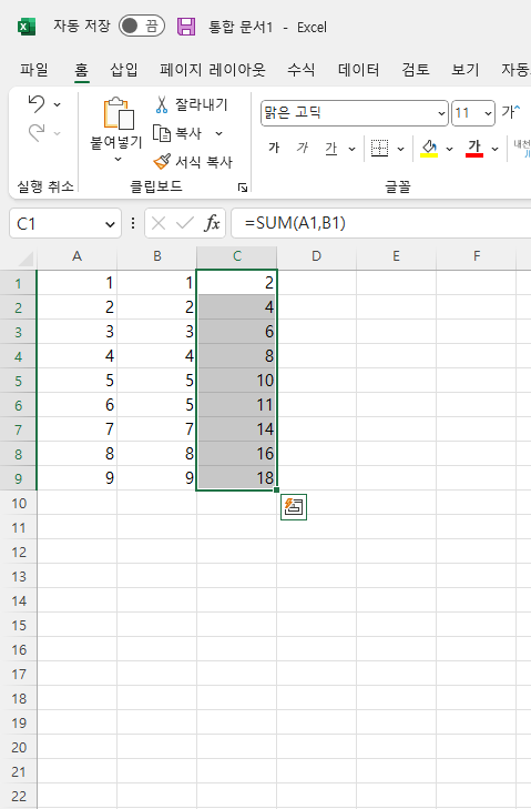 함수 셀을 클릭 후 복사하고 싶은 셀까지 이동 후