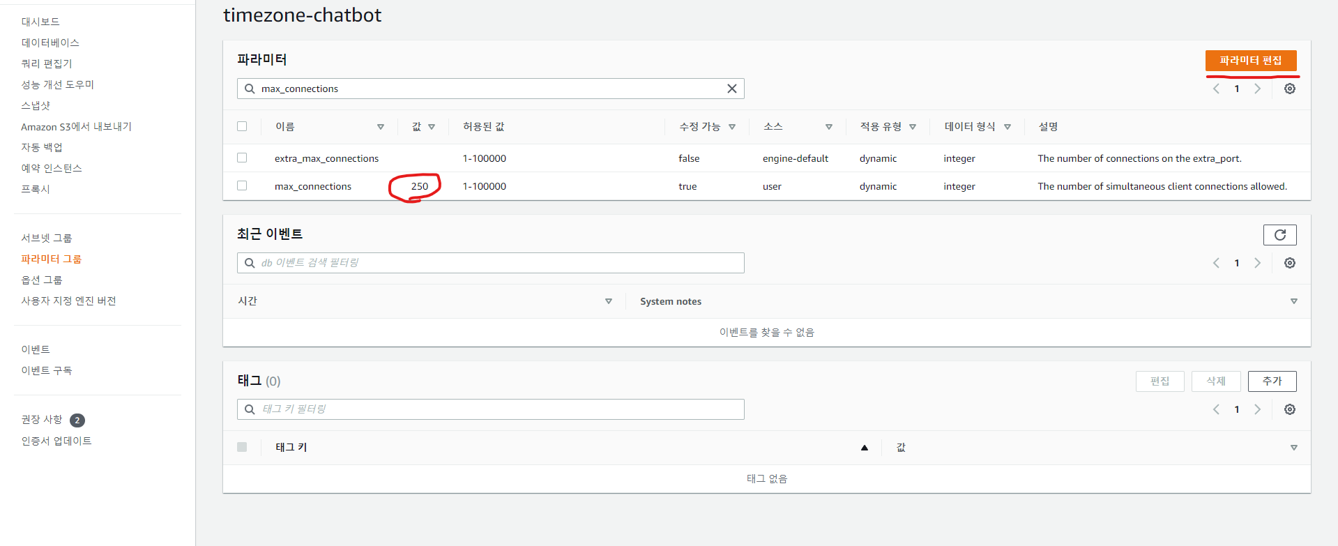 2. max_connections 를 검색 -> 파라미터 편집으로 원하는 값으로 변경