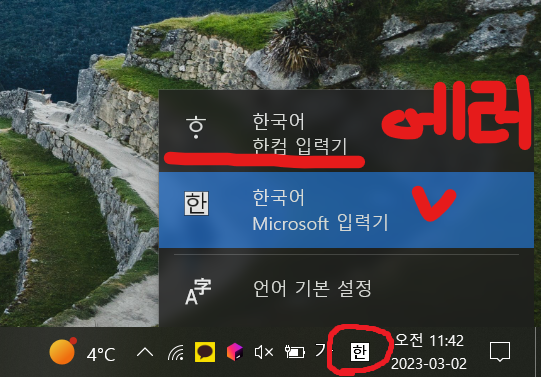 윈도우 한글이 한컴 입력기로 되어있었고, Microsoft 입력기로 바꿨더니 해결되었다.
