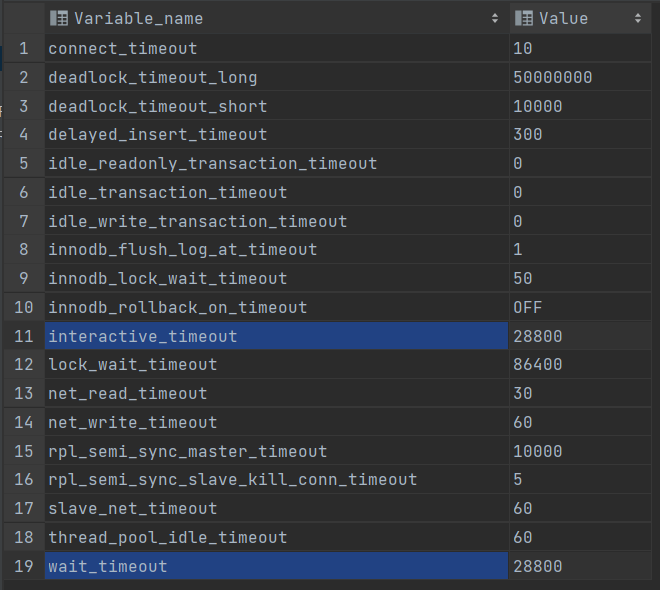 wait_timeout -> mysql 과 서버가 연결 후 쿼리 응답까지 기다려주는 시간