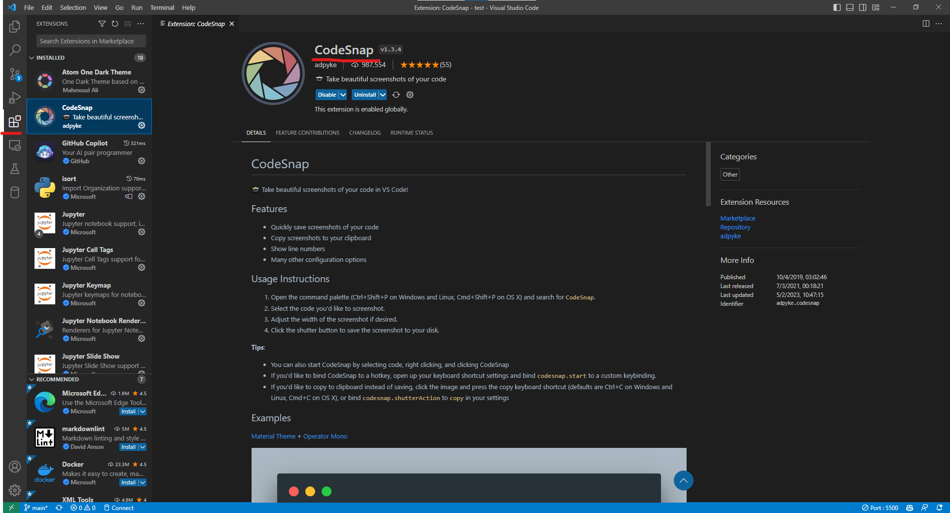 vscode -> 익스텐션 -> codesnap 검색 후 설치 !