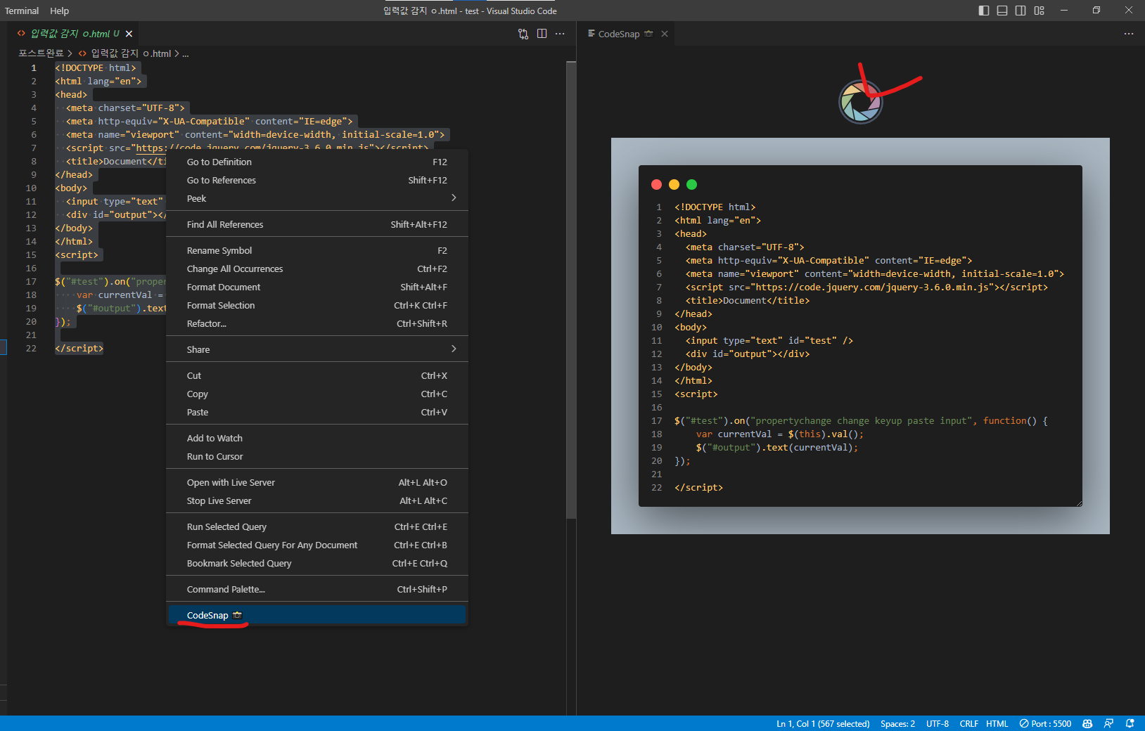 복사하고 싶은 코드 드래그 후 우클릭 CodeSnap 클릭 -> 저장은 오른쪽 사진기 모양 클릭