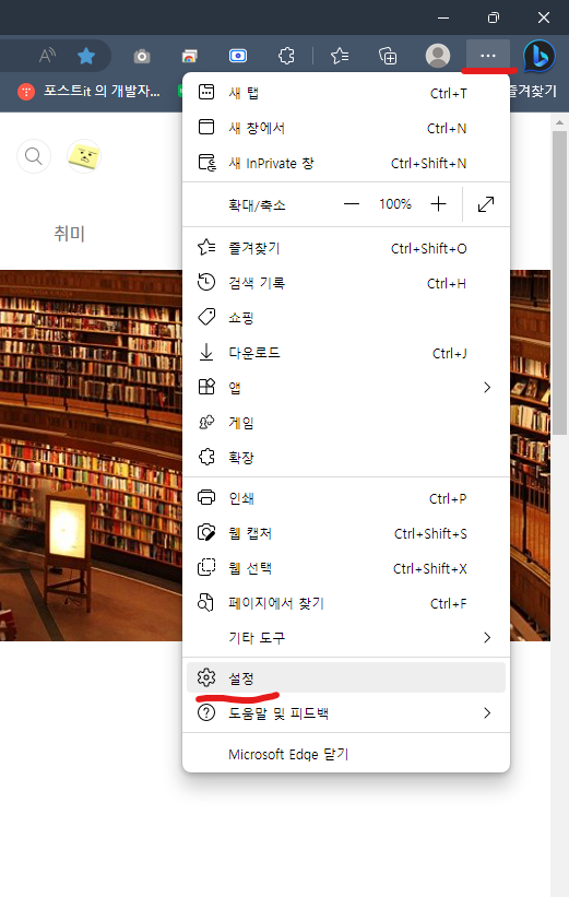 오른쪽위에 ··· 점 3개를 클릭 후 설정 창으로 이동합니다.