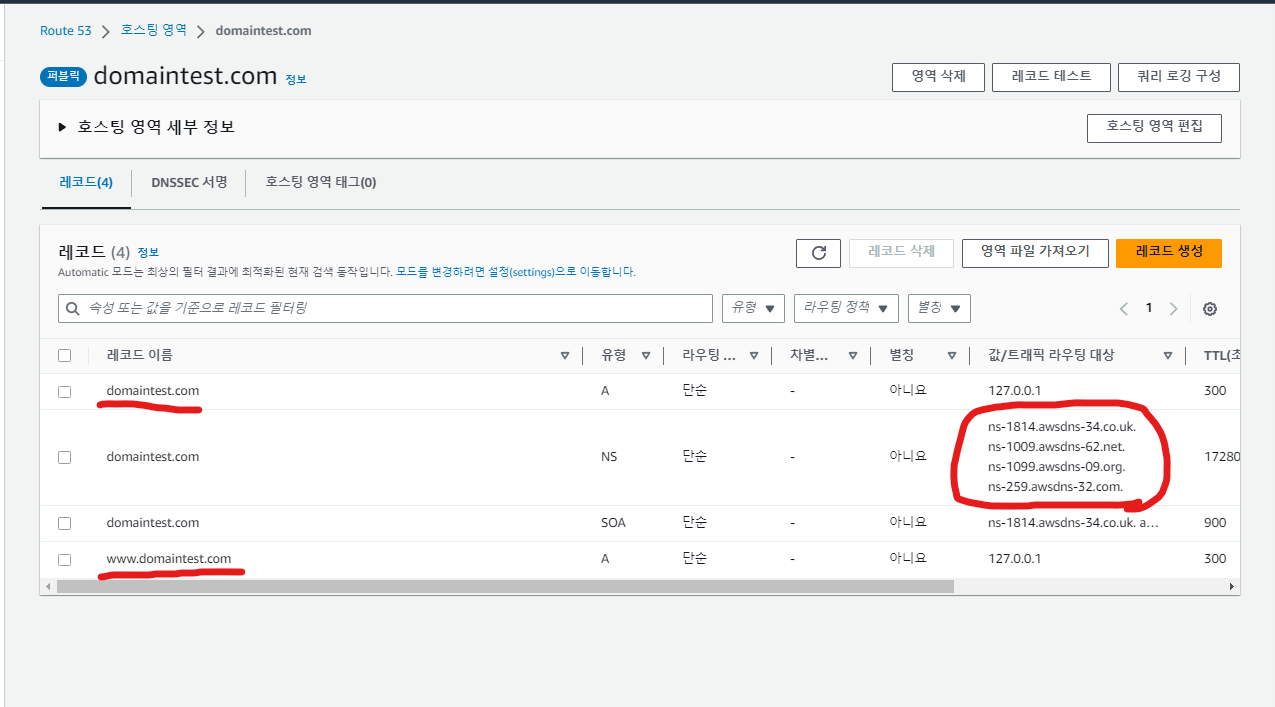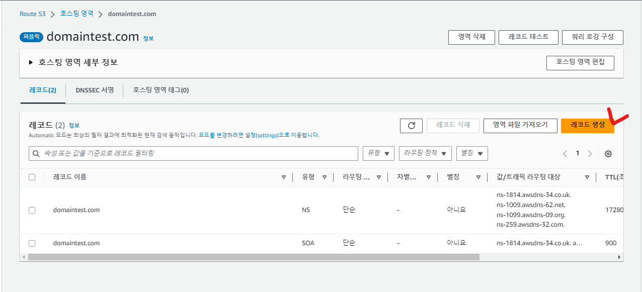 도메인 영역 생성 후 레코드 생성 클릭 !