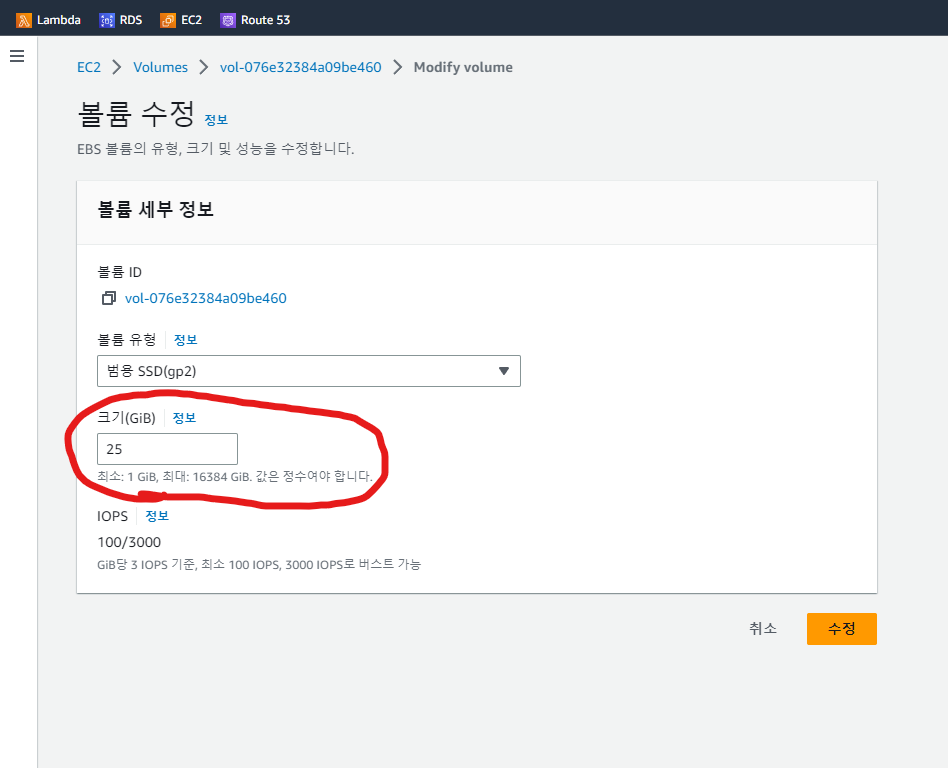 AWS EC2 로 접속 후 볼륨 메뉴 클릭 -> 볼륨 정보를 확인 후 늘려야할 볼륨 클릭 -> 작업에서 볼륨 수정 클릭