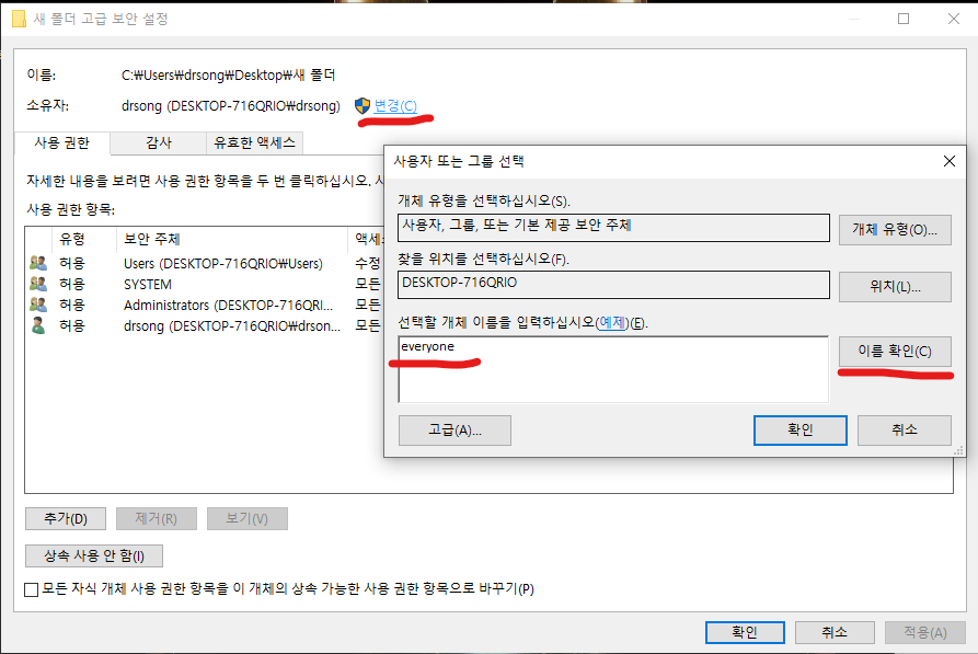 변경(C) -> everyone 입력 후 이름 확인 -> 확인