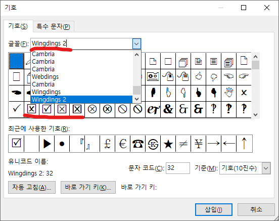 기호(S) -> Wingdings 2 글꼴 찾기