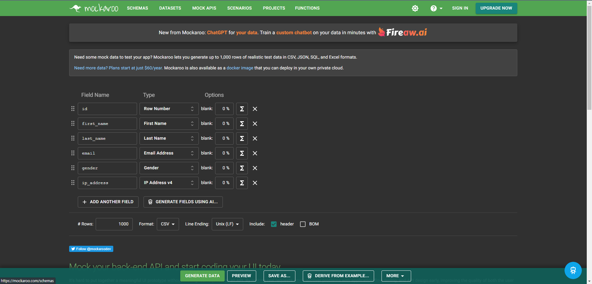 Mockaroo - Random Data Generator and API Mocking Tool | JSON / CSV / SQL / Excel