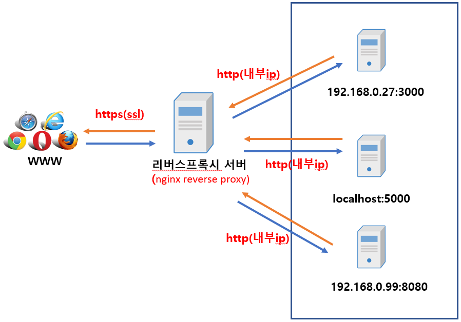 리버스프록시 서버에 ssl을 적용하고 나머지 ssl 적용하지 않은 하위서버와 통신한다고 생각하시면 되는데,