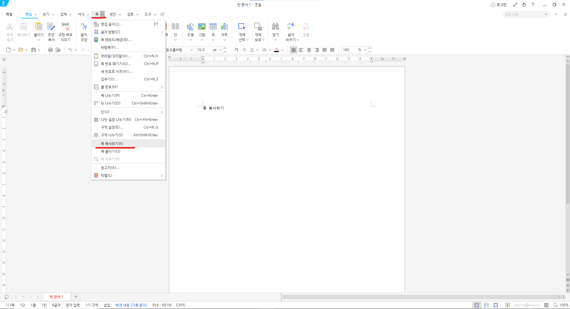 2. 메뉴바 -> 쪽 -> 쪽 복사하기(k)