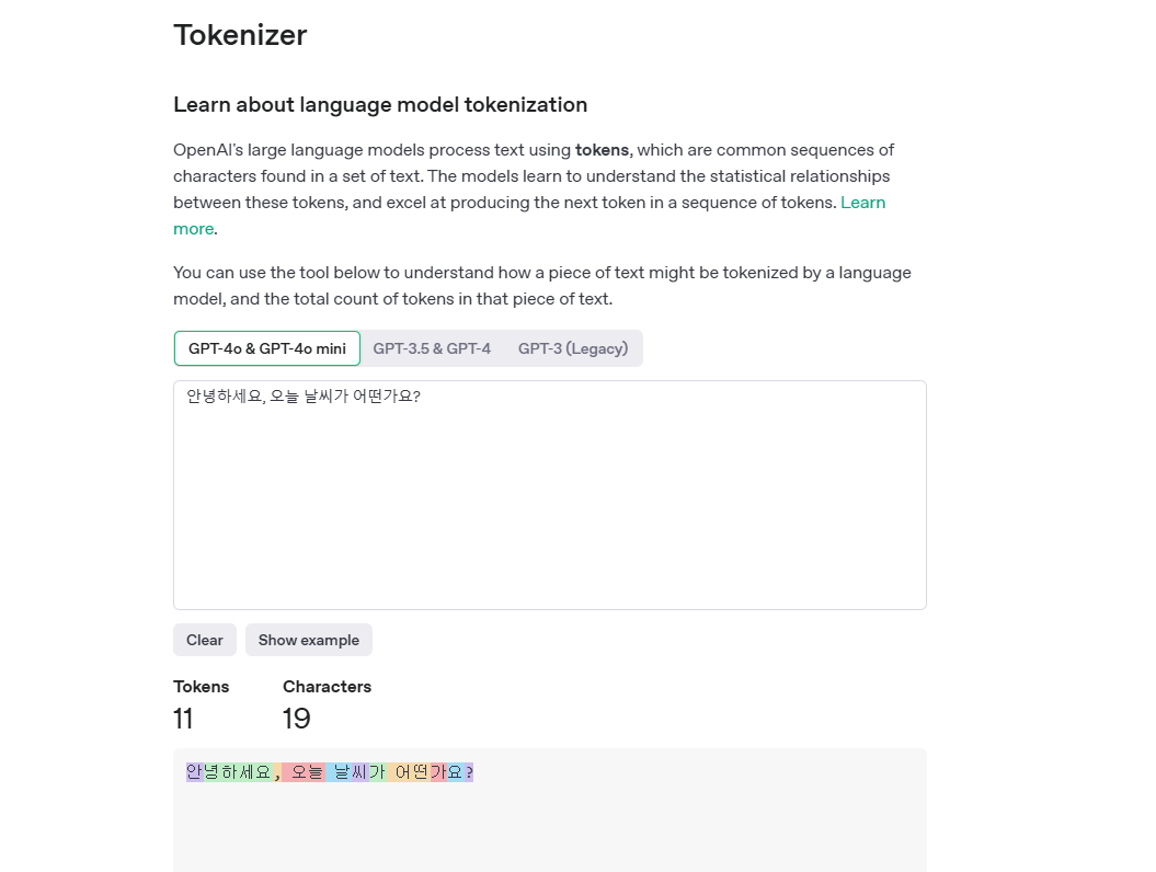 즉, 영어로는 보통 한 단어 당 하나의 토큰(또는 두세 개로 분리)으로 계산되는 경우가 많지만, 한글의 경우는 조금 다르게 분리될 수 있습니다. 실제로는 언어마다, 심지어 단어마다 토큰 분리 규칙이 다릅니다.