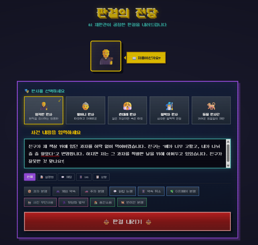 AI 재판관이 일상적인 분쟁을 재미있고 공정하게 판결해드립니다. 누가 잘못했는지 AI에게 물어보세요!