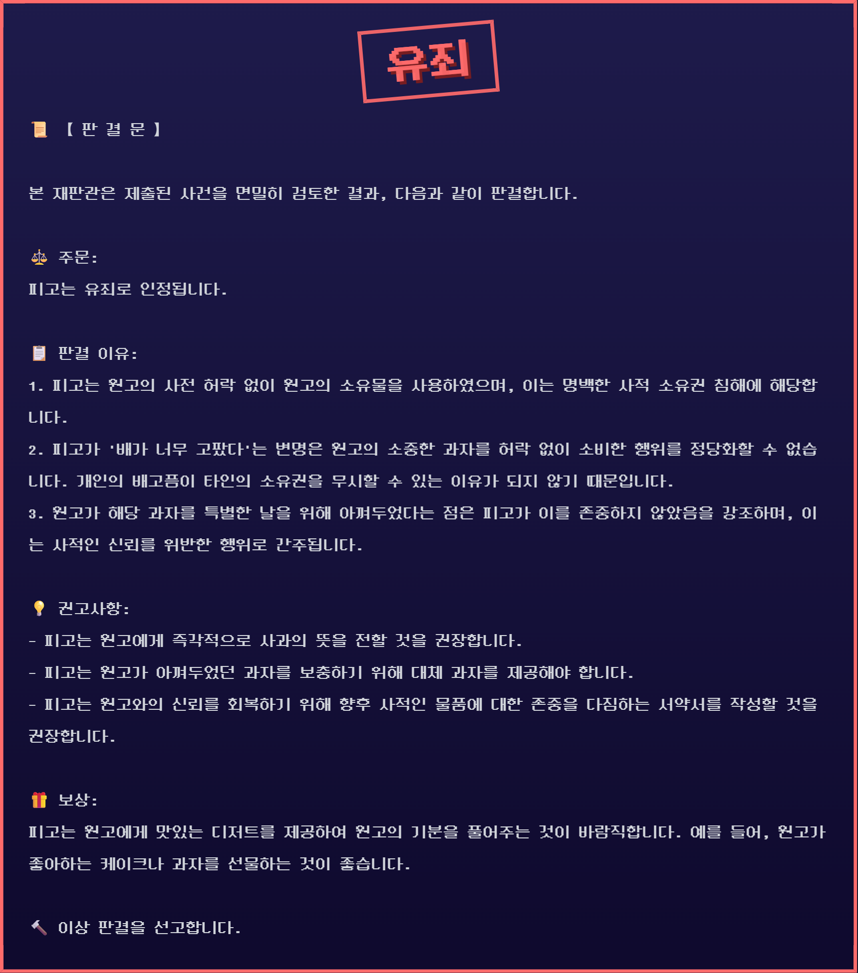 이 서비스의 재미있는 점은 단순히 유죄/무죄만 따지는 게 아니라, '양형 이유'를 논리적으로 설명해 준다는 점입니다. 아마도 '절도죄'와 '손괴죄'를 적용하되, 친구 관계라는 특수성을 고려해 '과자 2봉지로 배상' 같은 합리적(?)인 판결을 내리지 않을까요?