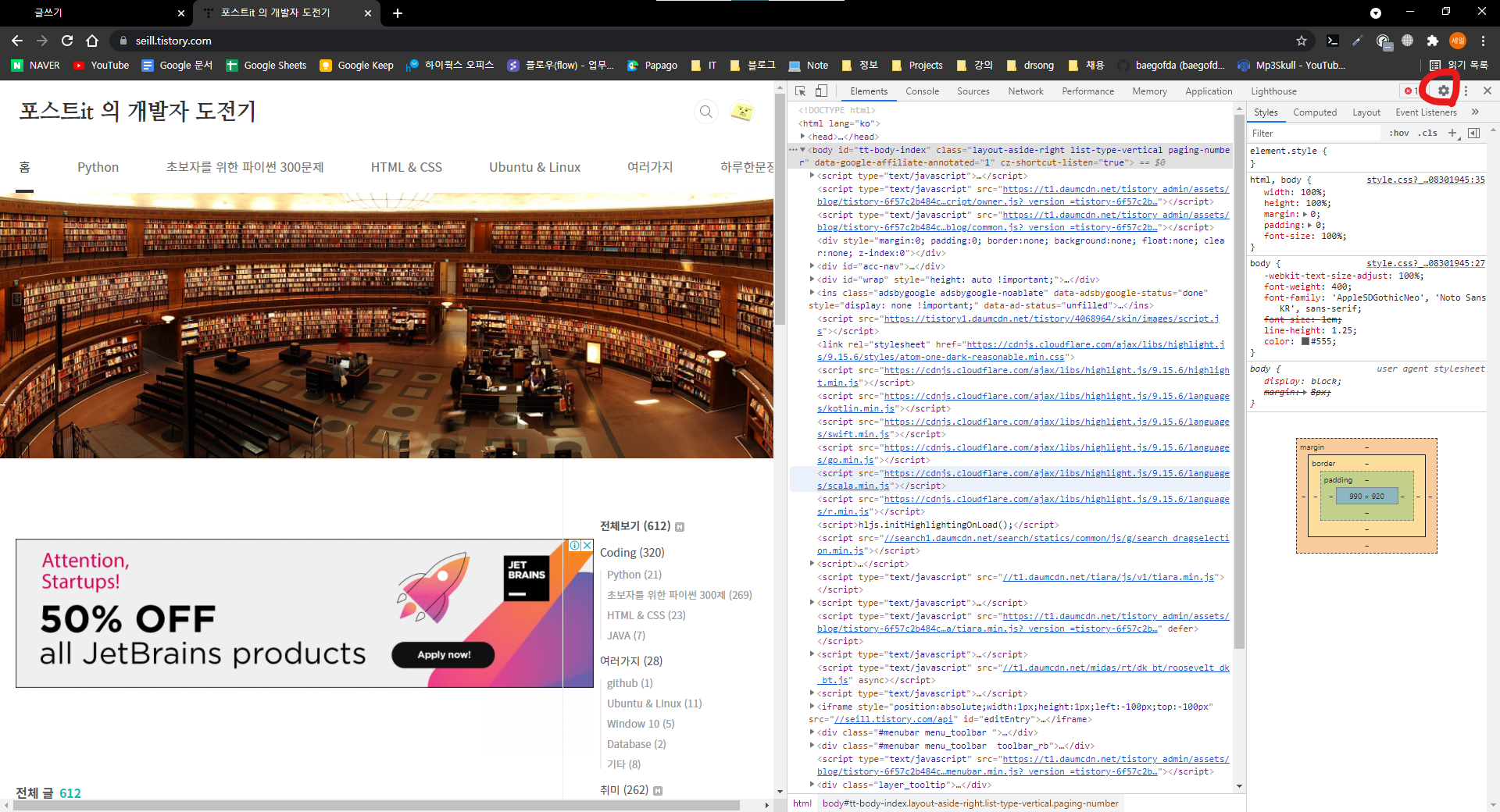 우선 드래그가 안되는 블로그 나 홈페이지에 들어가서 F12(우클릭 후 검사눌러도 가능)를 누르면 이런 화면이 나옵니다.