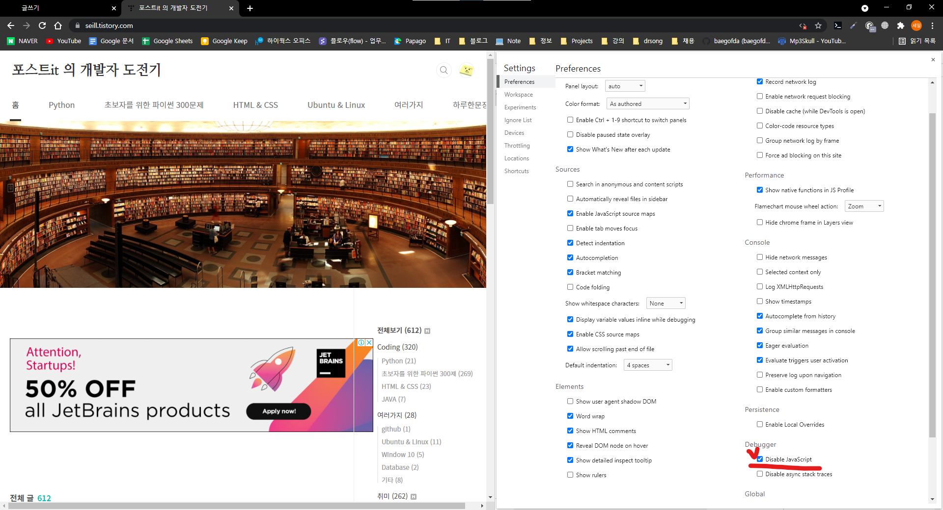 Debugger란에 Disable JavaScript 가 빈칸으로 되어 있을텐데