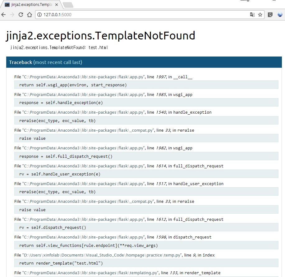 Python & Flask(플라스크) jinja2.exceptions.TemplateNotFound 에러 메세지 해결방법 !!