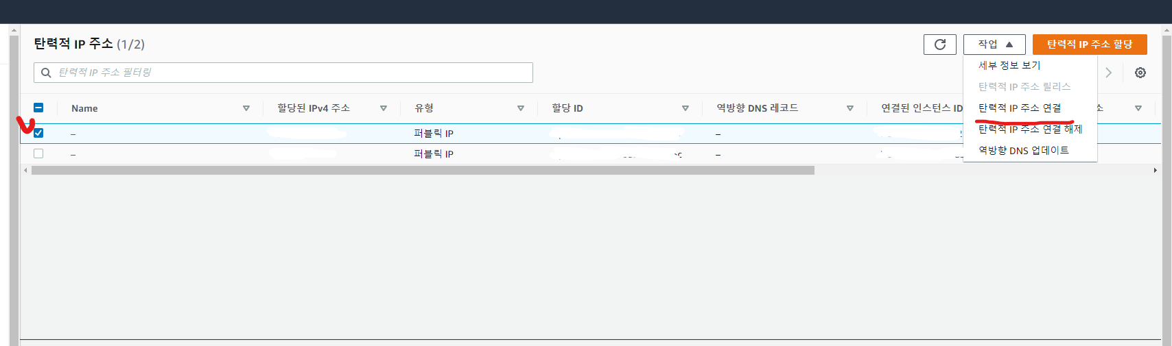 2. 할당 된 탄력적 IP 선택 -> 작업 -> 탄력적IP 주소연결