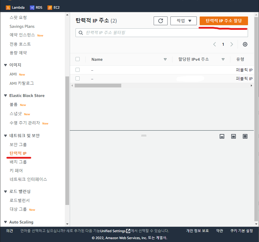 1. 네트워크 및 보안 -> 탄력적 IP -> 탄력적 IP 주소 할당