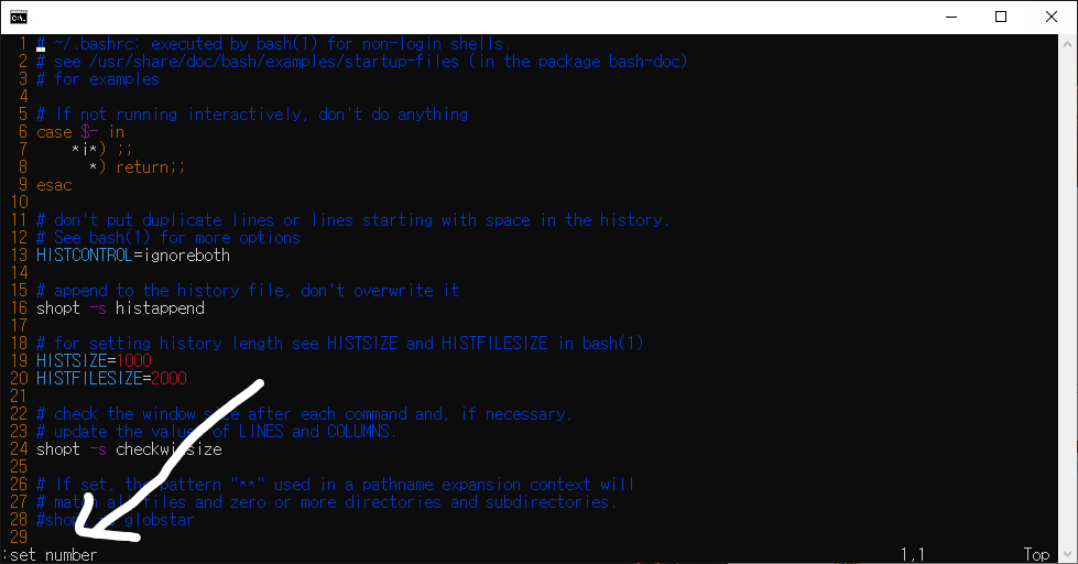 라인명령모드 전환-> set number 입력 (아래 사진 참조)