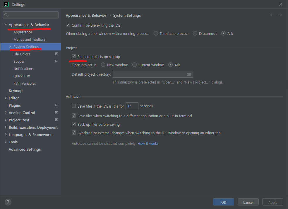 Appearance & Behavior -> System Settings 에 접속하셔서
