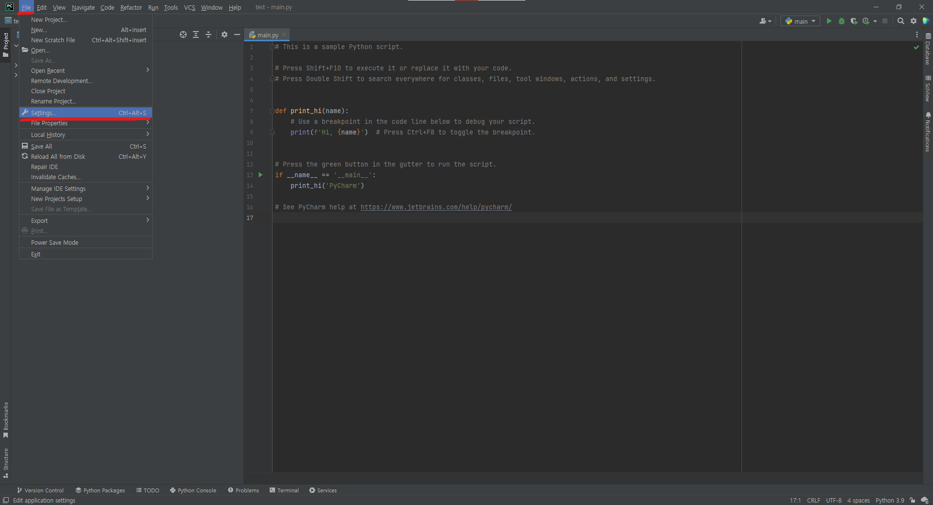File -> Settings 로 접속!