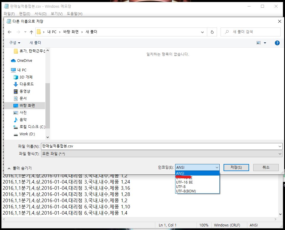 한글이 깨지는 .CSV 파일 우클릭 후 -> 연결 프로그램(H) -> 메모장 을 실행해 줍니다.